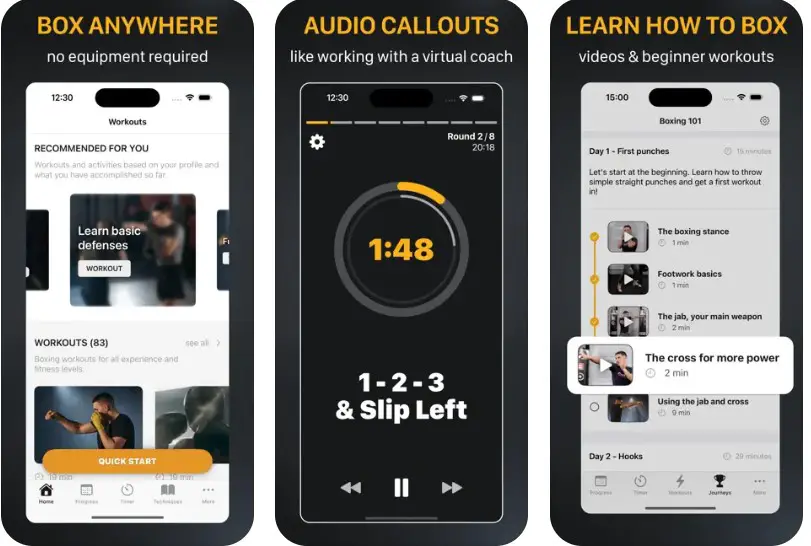The app offers guided routines, timers with rest intervals, and a builder tool for personalized workouts, covering boxing, Muay Thai, and more. Users can select from hundreds of pre-sets or create their own, with audio cues ensuring focus on form.