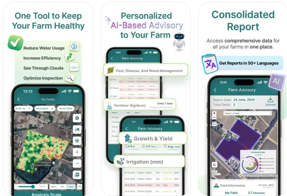 Farmonaut leverages affordable satellite monitoring to track carbon footprints and water efficiency without requiring expensive on-site sensors. Its AI-driven disease detection and nutrient deficiency alerts help organic farmers apply targeted interventions, aligning with regenerative agriculture by reducing chemical reliance.