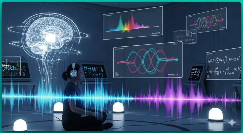It pulls data from your phone’s sensors or wearables—like Apple Watch for biofeedback—and adjusts frequencies accordingly (e.g., theta waves at 4-8 Hz for winding down).