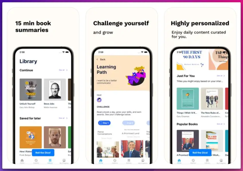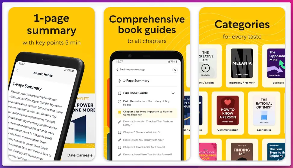 Headway and Blinkist dominate for self-help, with curated paths on topics like productivity and mindset, featuring titles like “Atomic Habits.” Headway’s gamification boosts habit formation, while Blinkist’s daily insights keep motivation high for ongoing growth.