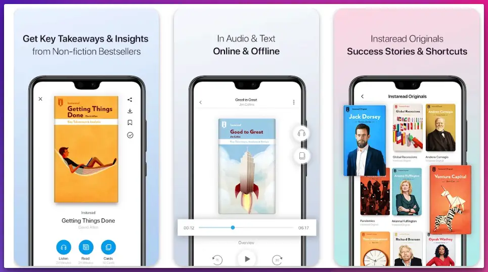 | Instaread | Audio enthusiasts, multitaskers | $8.99/mo or $89/yr | 1,000+ books | Text, Audio | Lifetime access option ($299) |