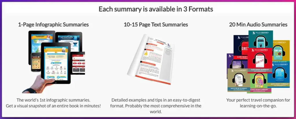| Readingraphics | Entrepreneurs, visual thinkers | $7.50/mo or one-time purchases | 500+ books | Text, Audio, Infographic | One-page infographic summaries |