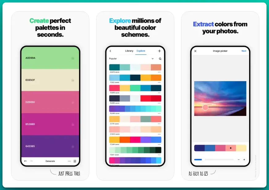 | Coolors | iOS, Android, Web | Free / Premium varies | Random inspiration for web/UI designers | Random palettes, exports (PNG/PDF), HSB/RGB editing |