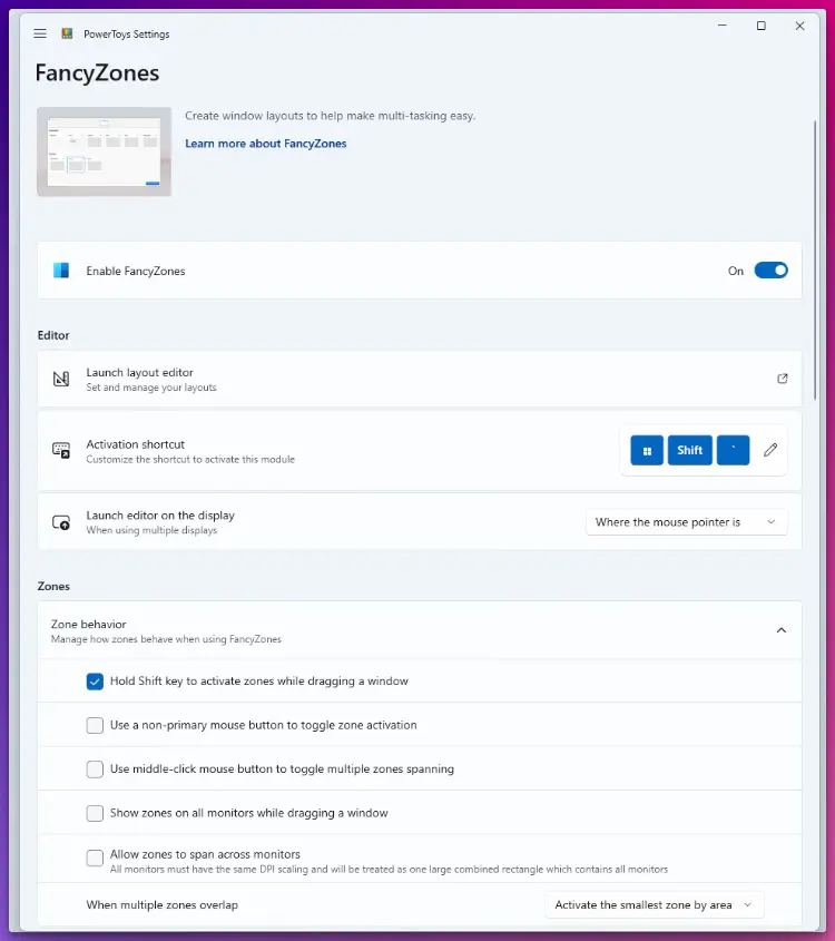 - FancyZones: Create custom window layouts (e.g., 3×2 grids, vertical splits) and snap apps with a hotkey.