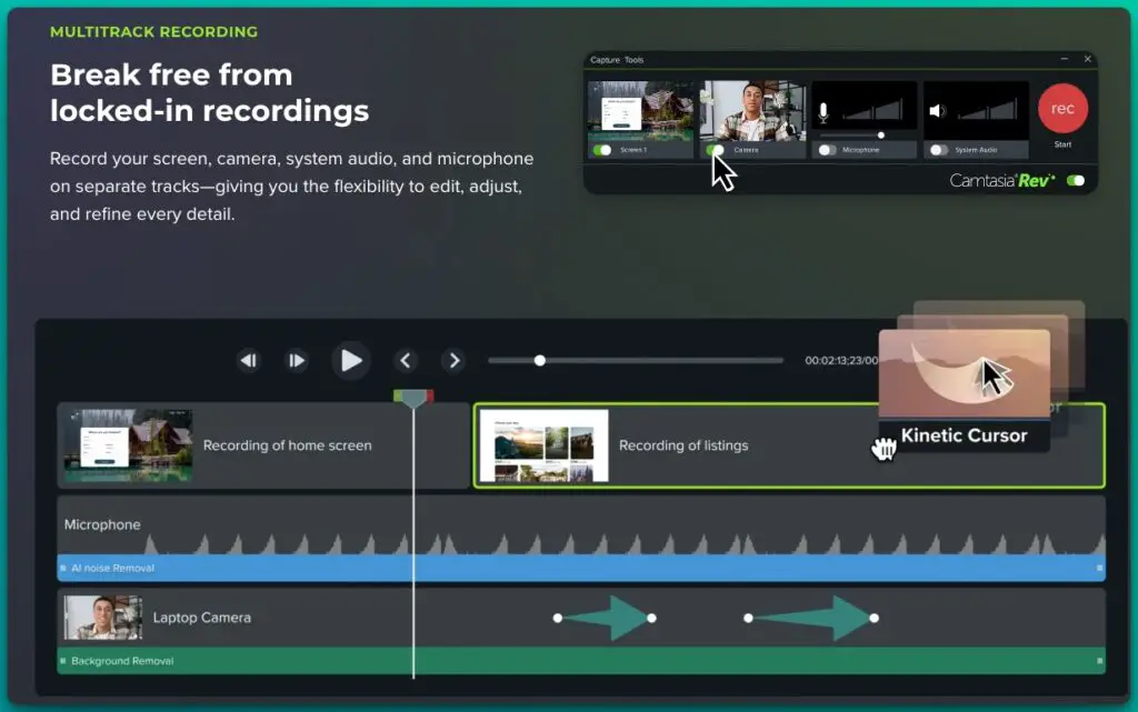 For educators, Camtasia shines with AI-powered editing tools, templates, and annotations for tutorial videos at $179/year, allowing seamless screen captures and 4K exports.