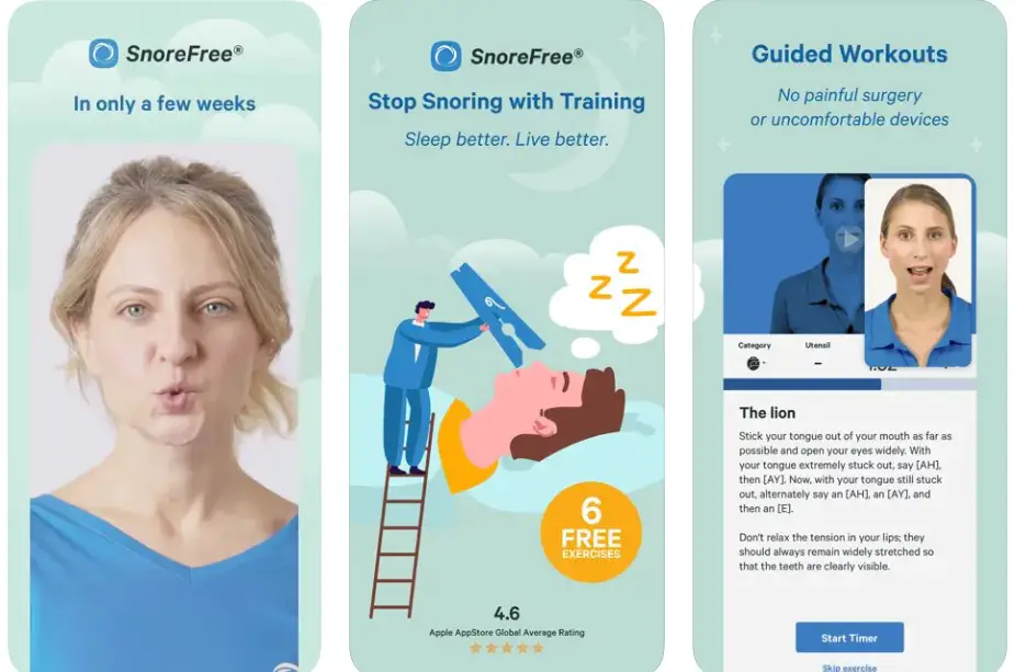 | Snore Free | Exercise-Based Reduction | Free; 3-month $26.99 | Guided anti-snoring workouts | 4.6 |