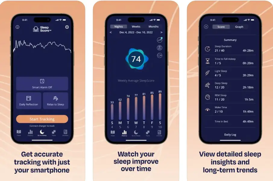 SleepScore distinguishes itself among the best snoring apps with its pioneering sonar-based tracking, introduced around 2015. Using inaudible ultrasonic waves from your smartphone, it maps breathing and snoring patterns without physical contact, accurately distinguishing snores from teeth grinding.